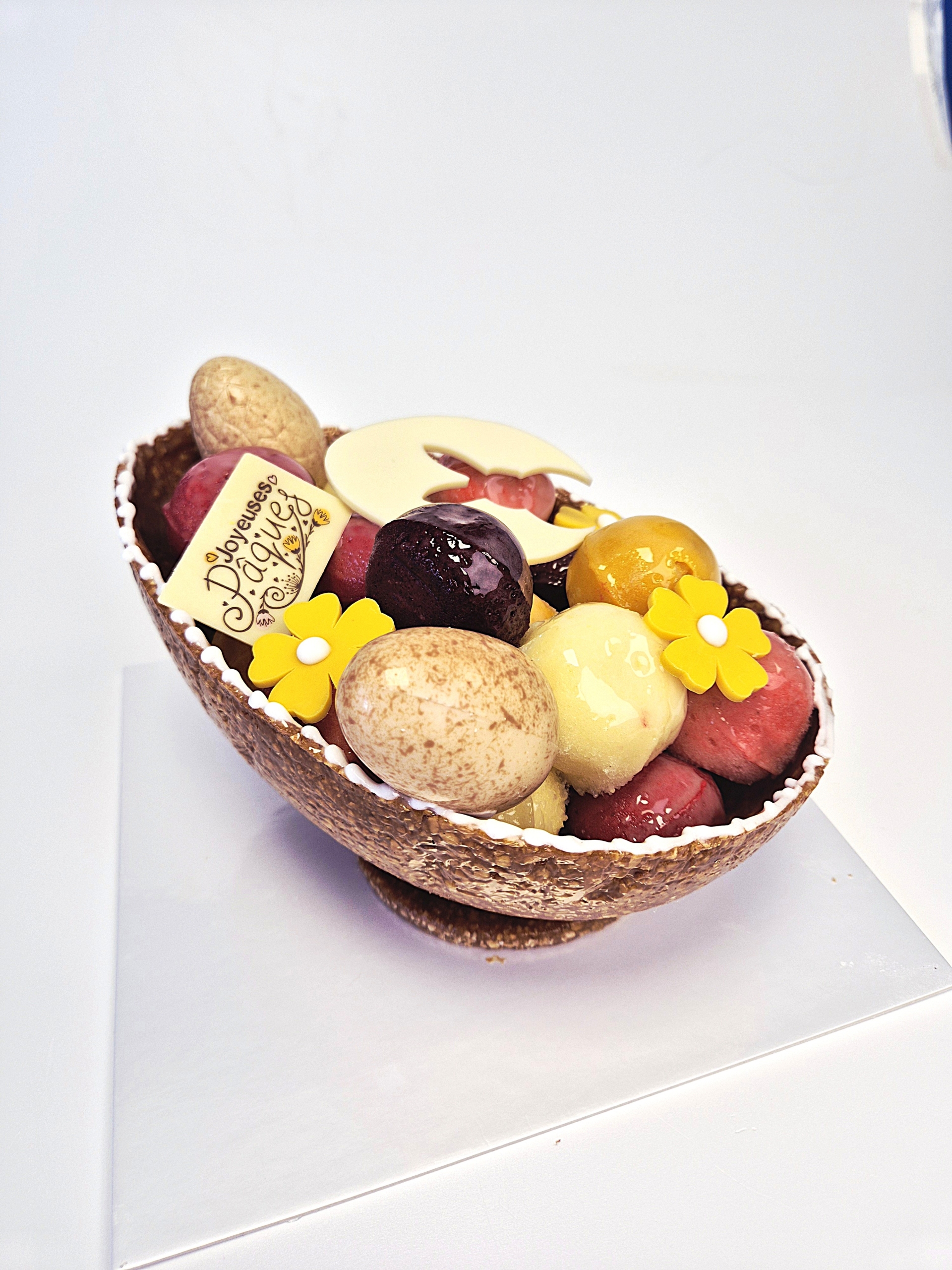 Disponible du 3 au 6 avril. Œuf en nougatine garni d’un assortiment de sorbet maison : fraise, framboise, citron, mangue-passion et cassis,