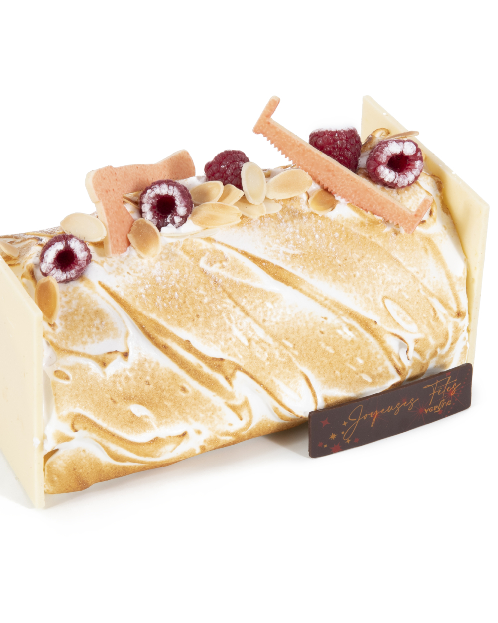 Disponible du 13 au 31 décembre. Génoise punchée au rhum, crème mousseline rhum incrustée de framboises et de raisins au rhum, le tout recouvert d’une meringue flambée au four. Taille unique 5 personnes.