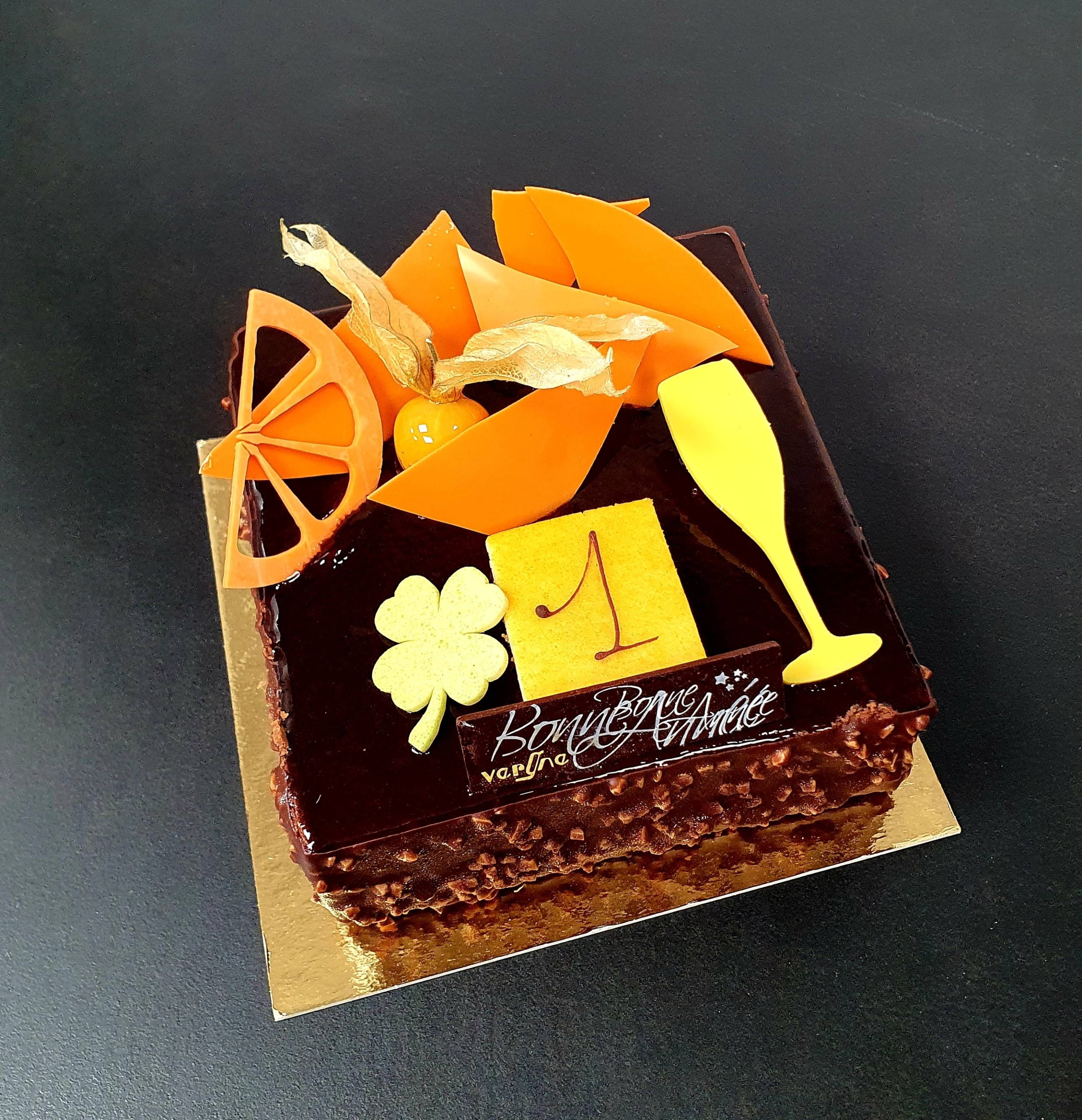 Disponible du 23 au 31 décembre. Mousse chocolat signature noir et crème mascarpone vanille, confit de griottes et biscuit chocolat amandes (sans farine). Gluten Free