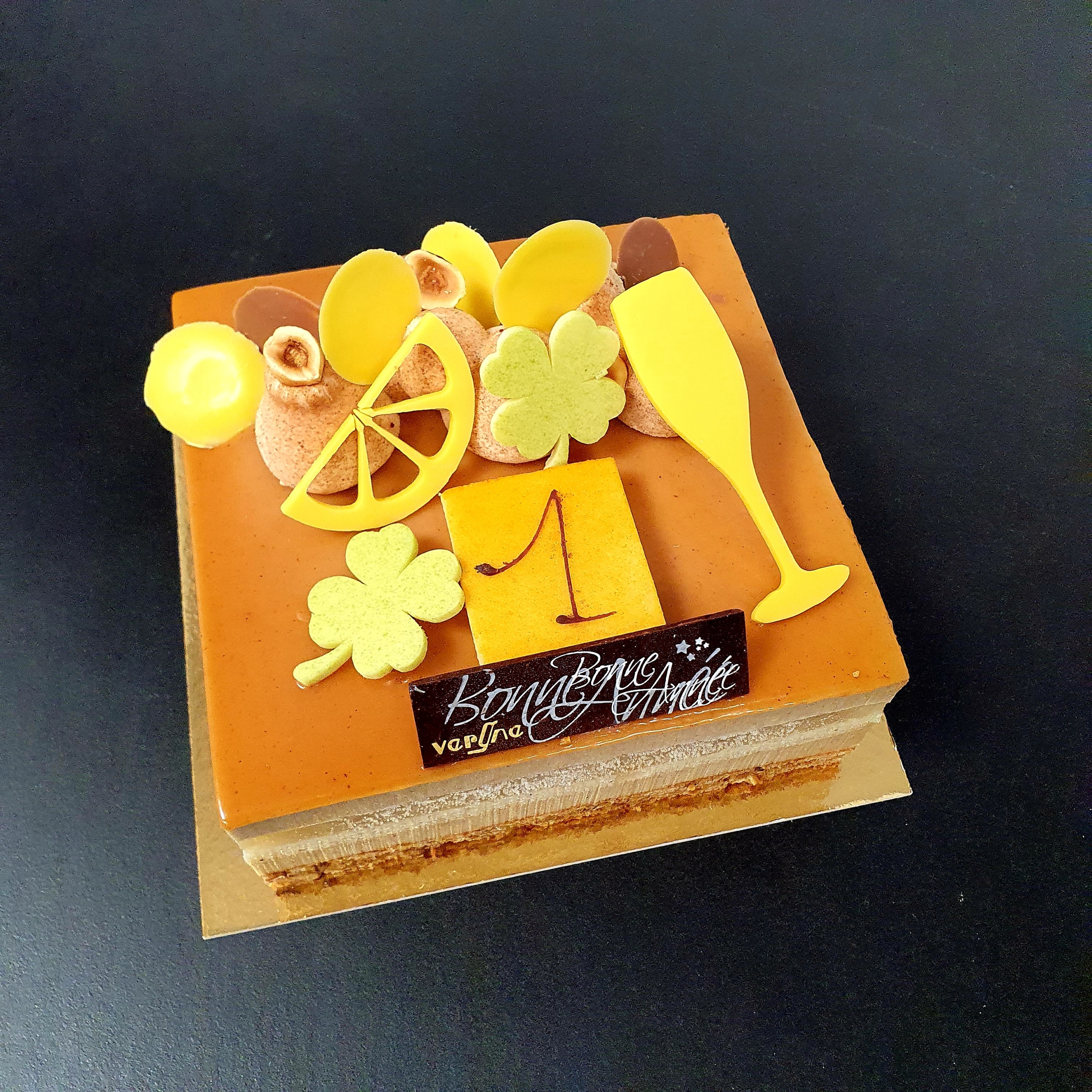 Disponible du 23 au 31 décembre. Mousse chocolat signature noir et bavaroise praliné amande, biscuit chocolat croustillant.