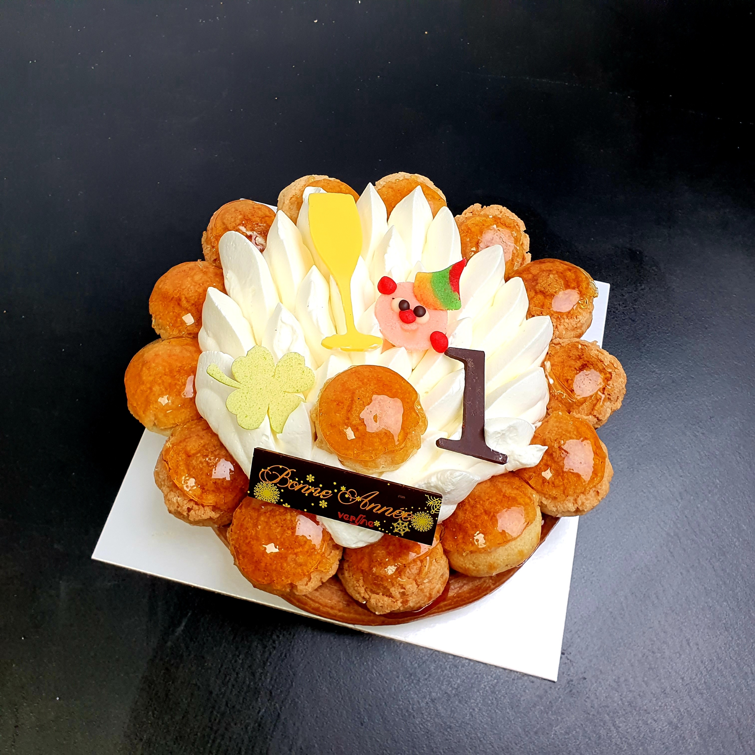 Disponible uniquement le  31 décembre. Aux trois crèmes : pâtissière, maison légèrement réhaussée de kirsch d’Alsace et chantilly. Taille unique 4/5 personnes