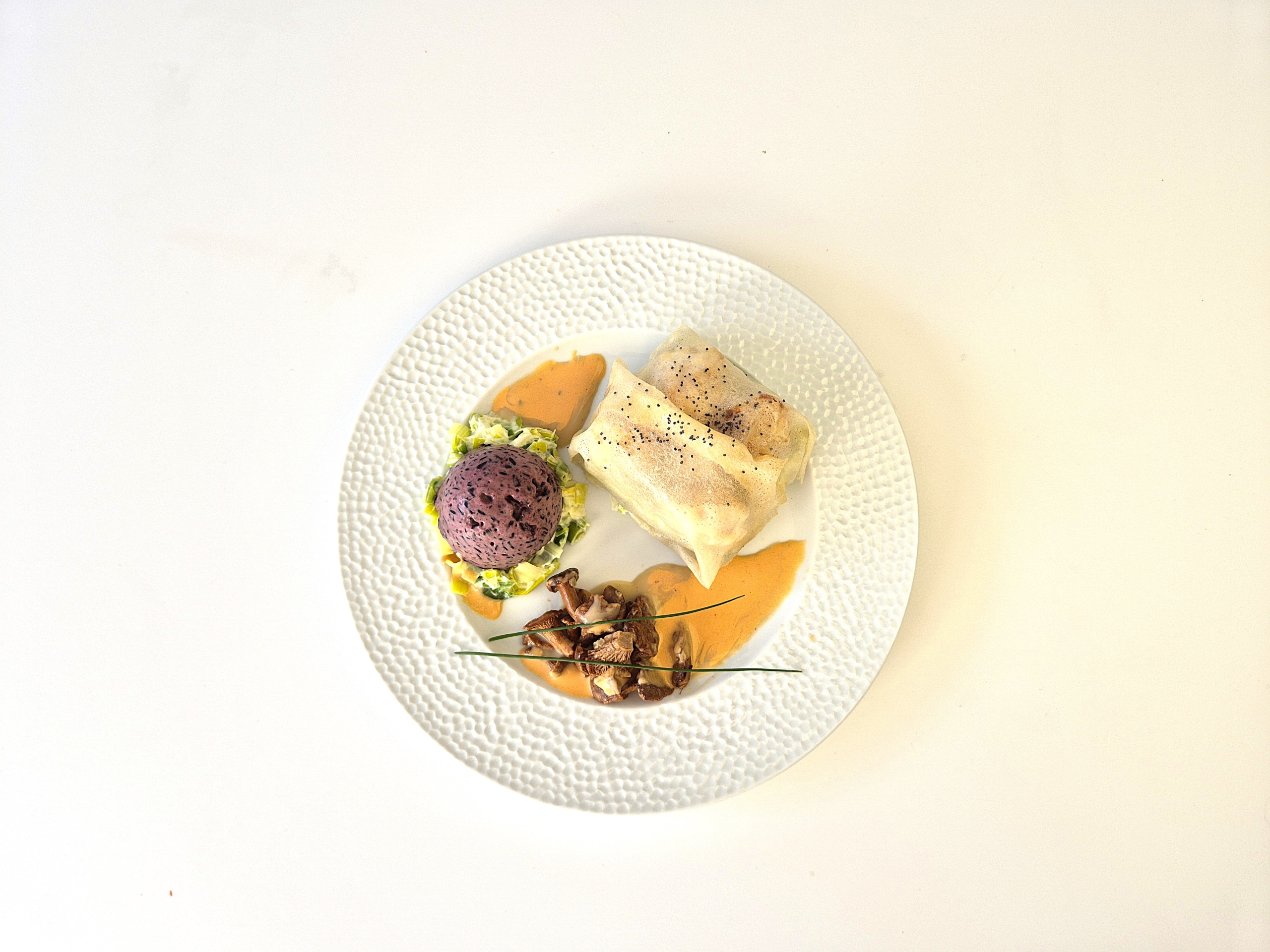 Disponible du 12 décembre au 4 janvier 2026. Farce de cabillaud au persil plat, girolles, fondue de poireaux et riz noir, sauce Aurore au Champagne.