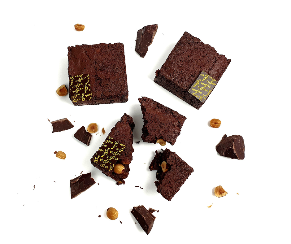 Brownie au chocolat grand cru Guanaja 70 %, avec des noisettes du Piémont et des noix de pécan.