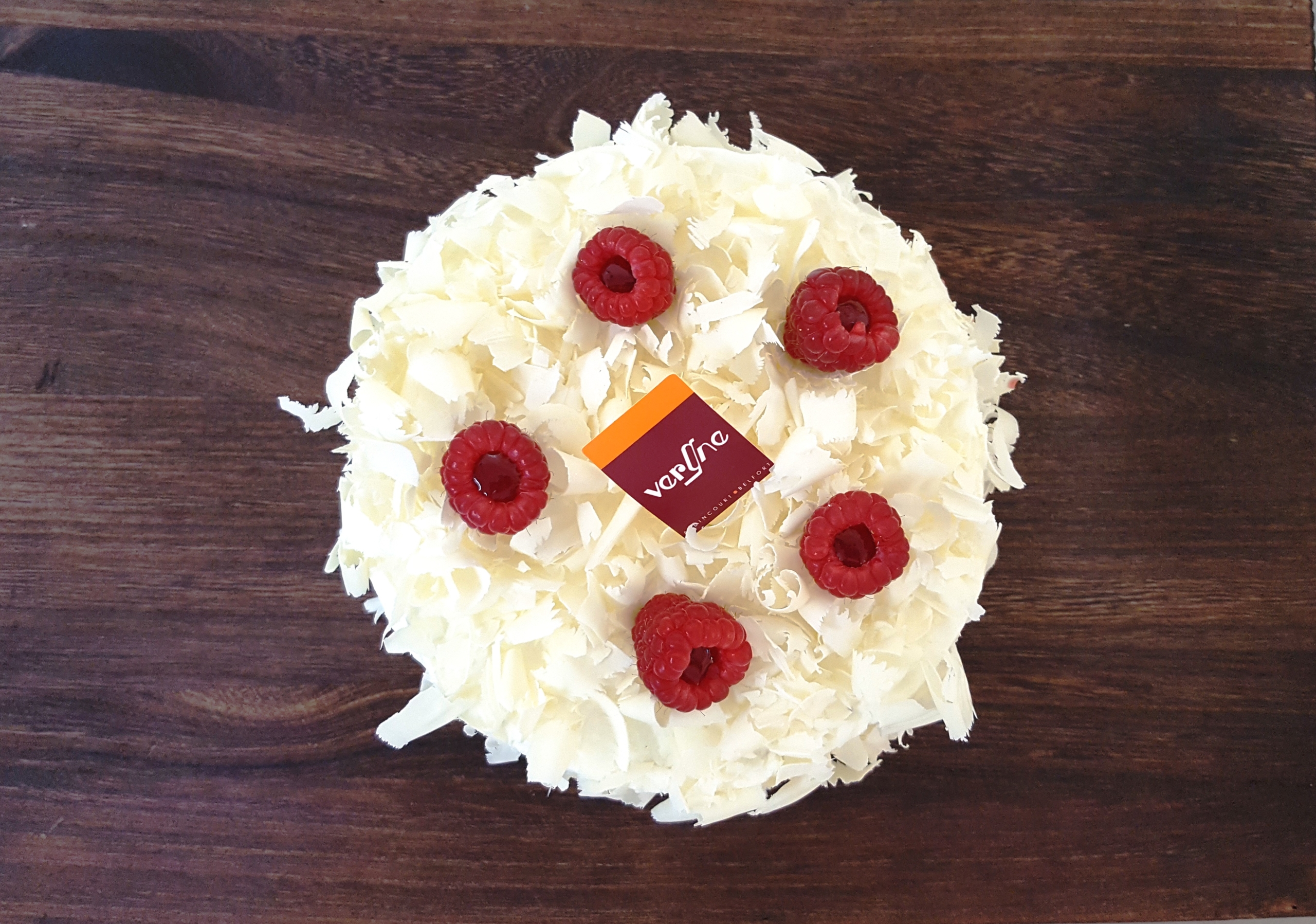 biscuit (très) moelleux parfumé à l’eau de vie de framboises d’Alsace, garni d’une crème maison diplomate et de framboises entières. Le tout est recouvert de Chantilly et de copeaux de chocolat blanc.