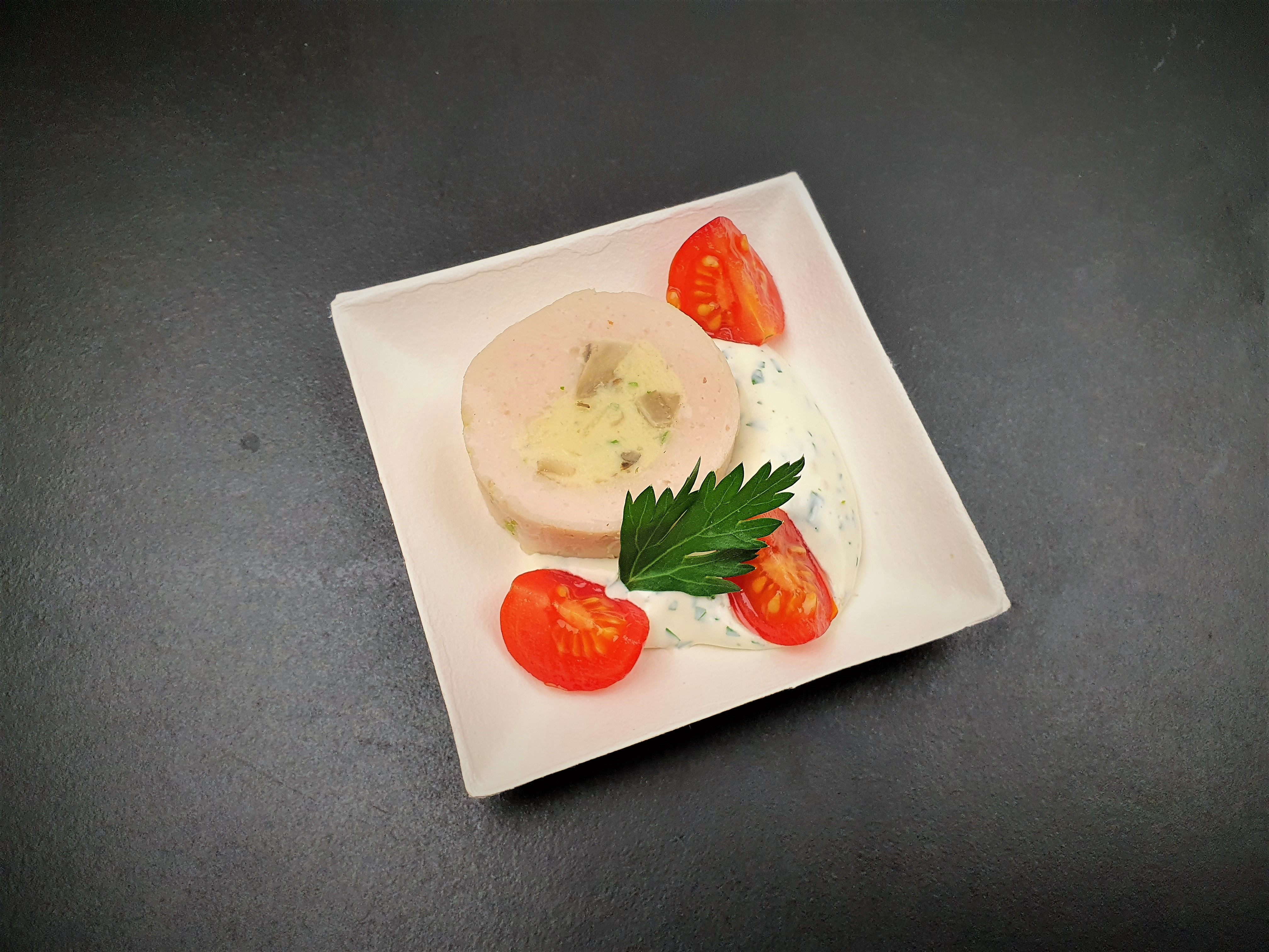 Roulade de poulet fermier, céleri et pleurotes, crème mousseuse au persil plat
